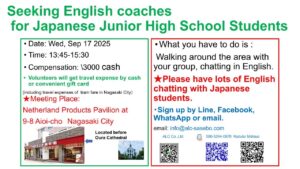 留学生(りゅうがくせい)を募集(ぼしゅう)してます 2025年9月9日 学生募集 留学生(りゅうがくせい)を募集(ぼしゅう)しています! ㅤㅤㅤㅤ 9月(がつ)17日(にち)に、修学(しゅうがく)旅行(りょこう)で 長崎(ながさき)に来(く)る学生(がくせい)と 街歩(まちある)きをしてくれる留学生(りゅうがくせい)を募集(ぼしゅう)しています。 ㅤㅤㅤㅤ 詳細(しょうさい)、質問(しつもん)、申込(もうしこ)みは、 チラシを見(み)てください。