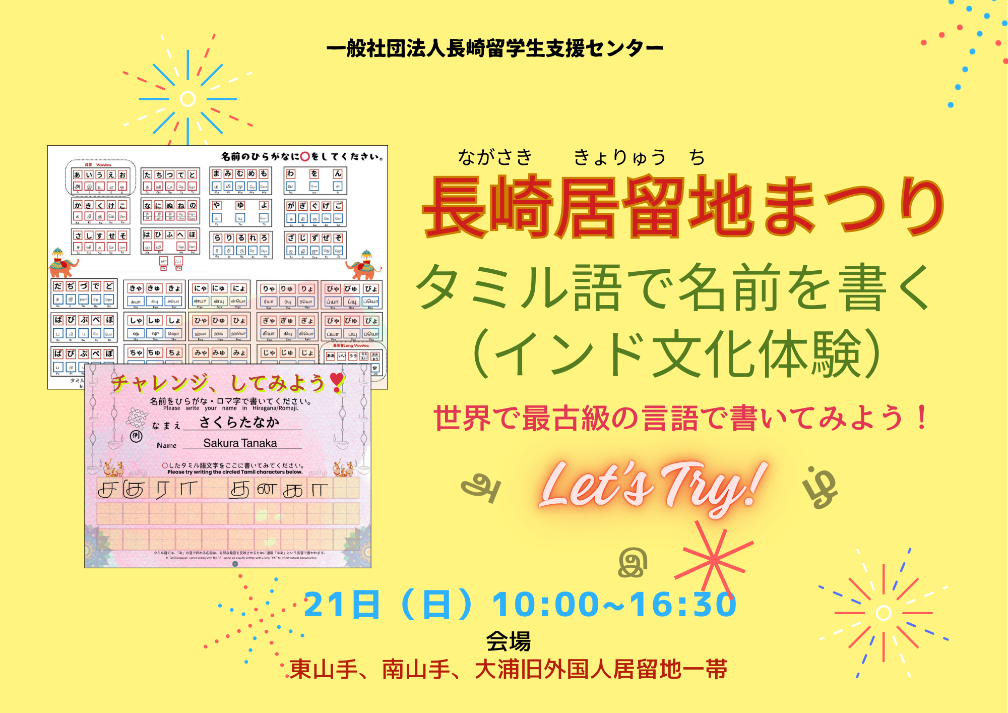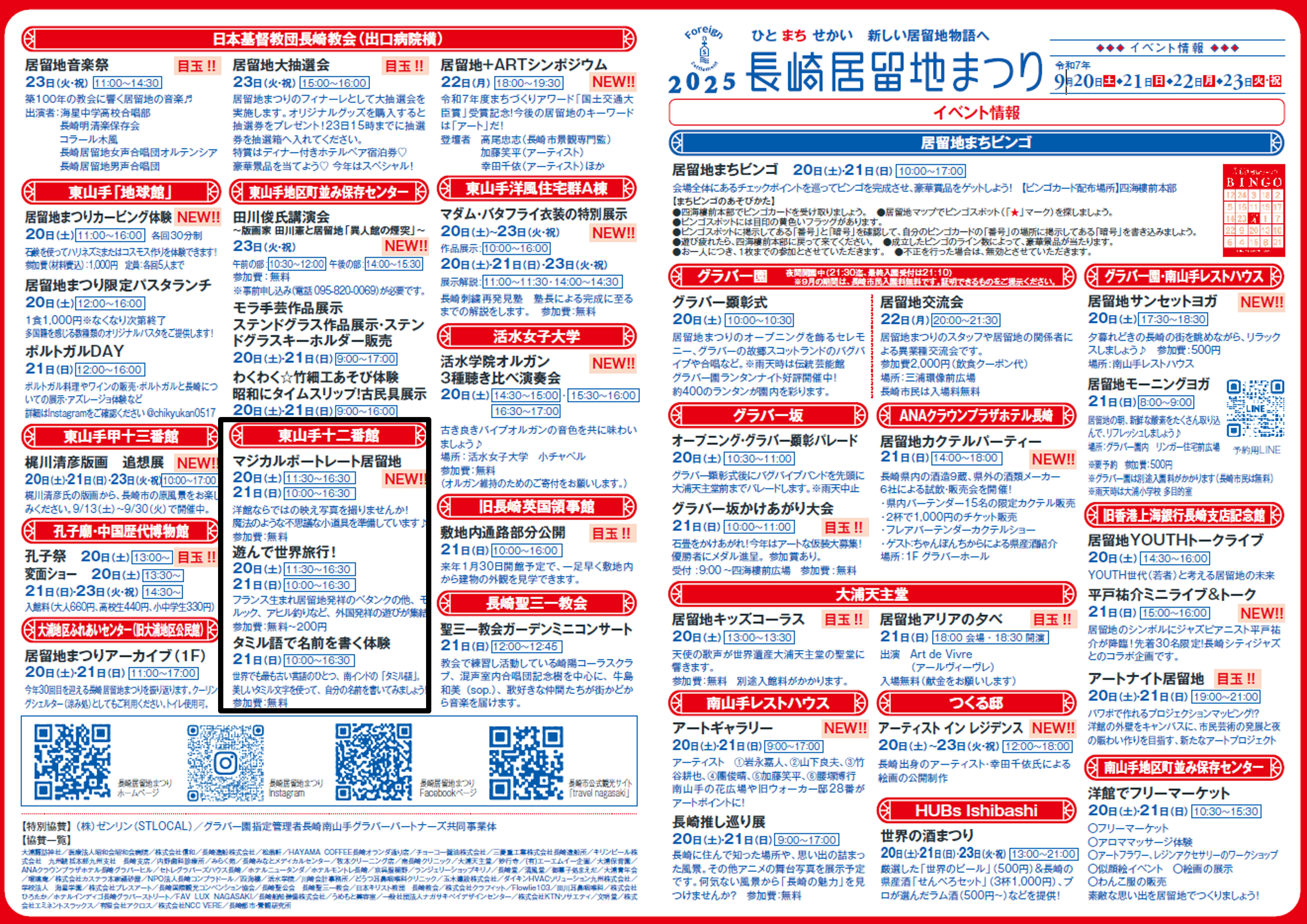 「長崎(ながさき)居留地(きょりゅうち)まつり」でのセンターのブースの場所(ばしょ)が決(き)まりました! 2025年9月18日 情報発信 センターからのお知(し)らせ ㅤㅤㅤㅤ センターからブースを出展(しゅってん)いたします 「長崎(ながさき)居留地(きょりゅうち)まつり」につきまして、 日時(にちじ)と会場(かいじょう)が決定(けってい)しましたので、お知(し)らせいたします。 ㅤㅤㅤㅤ 日時(にちじ):9月(がつ)21日(にち)(日(にち)) 10:00~16:30 会場(かいじょう):東山手(ひがしやまて)十二番館(じゅうにばんかん) ㅤㅤㅤㅤ 詳(くわ)しいことや他(ほか)のイベントについても、チラシを見(み)てください ㅤㅤㅤㅤㅤㅤㅤ お待(ま)ちしております ㅤㅤㅤㅤ 長崎居留地まつり https://nagasakiforeignset.wixsite.com/home