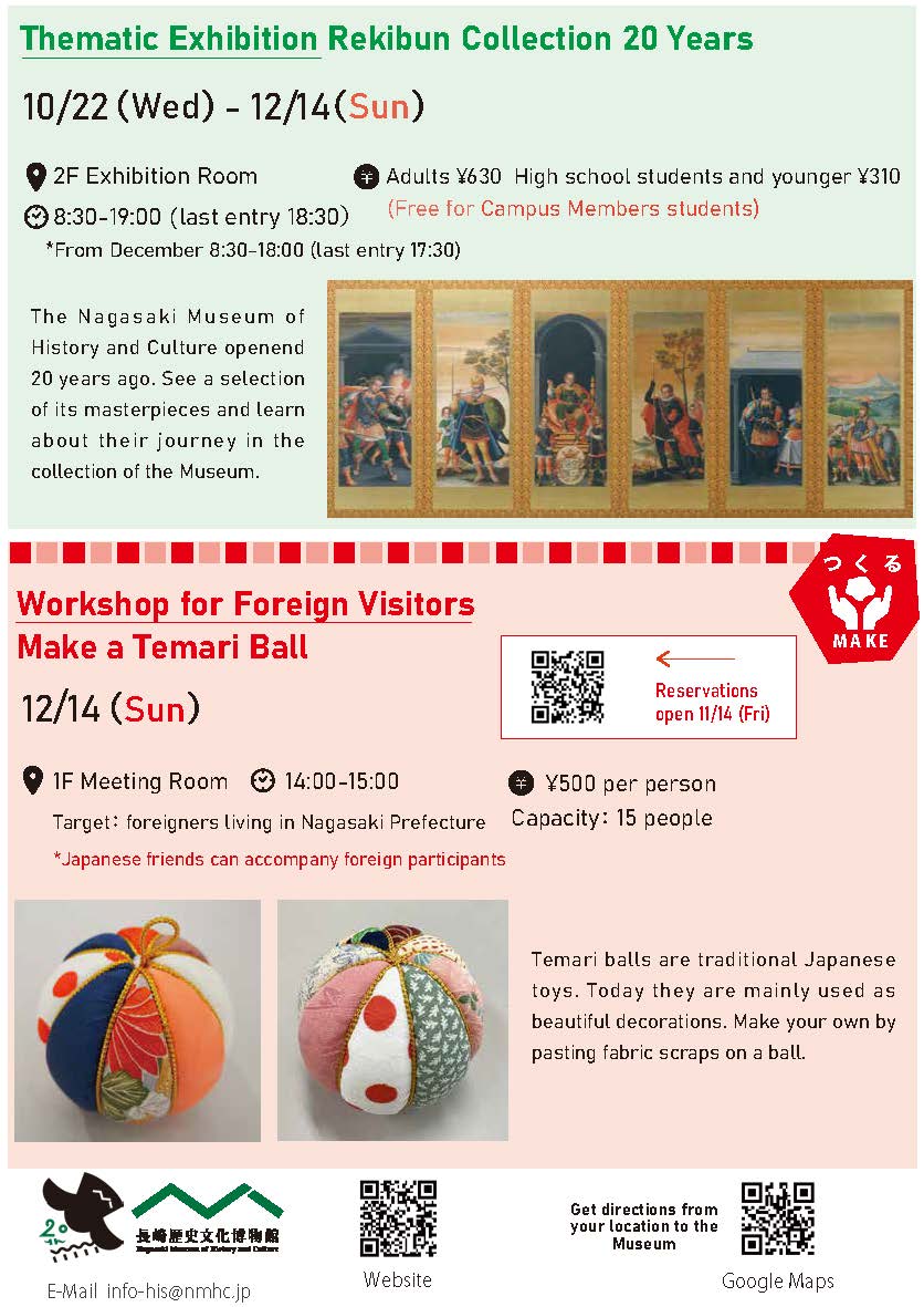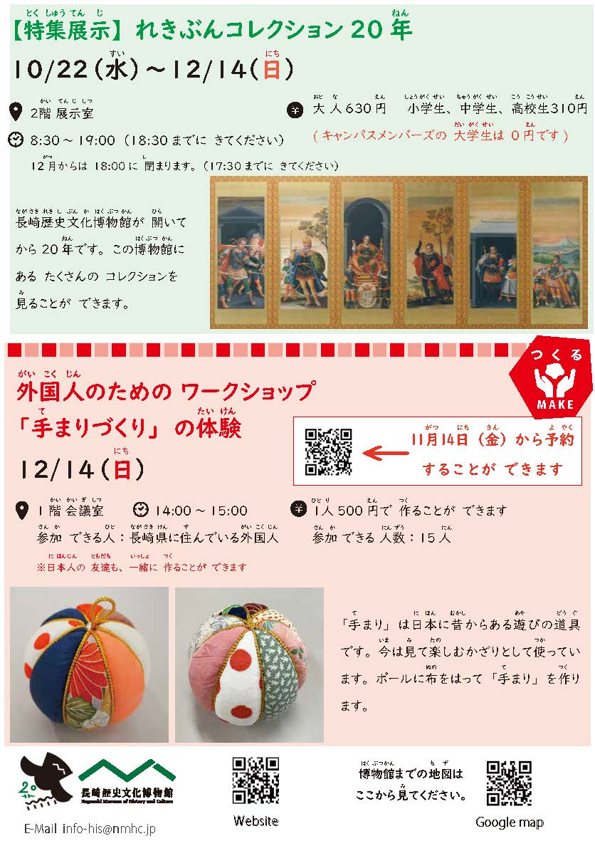 イベントおしらせ 2025年11月21日 情報発信 イベントのおしらせ ㅤㅤㅤㅤ 長崎(ながさき)歴史(れきし)文化(ぶんか)博物館(はくぶつかん)のイベントです。 ㅤㅤㅤㅤ 外国人(がいこくじん)のためのワークショップ 「手(て)まりづくり」の体験(たいけん) ㅤㅤㅤㅤ 詳細(しょうさい)や申込(もうしこ)みは、チラシを見(み)てください 申込(もうしこ)みは、チラシのQRコードか、 ⬇️のリンクからお願(ねが)いします。 申込(もうしこ)みフォーム https://forms.gle/z6mqving4VK389aX9