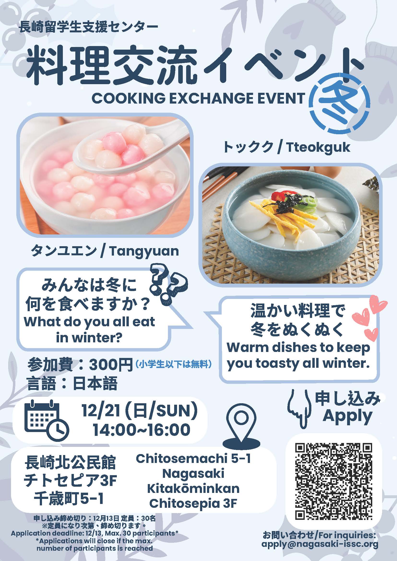 イベント 申込(もうしこ)み受付(うけつけ)中(ちゅう)です! 2025年11月27日 情報発信 センターからおしらせです ㅤㅤㅤㅤ 「料理(りょうり)交流(こうりゅう)イベント」 参加(さんか)受付(うけつけ)中(ちゅう)です ㅤㅤㅤㅤ 地域(ちいき)の方(かた)と留学生(りゅうがくせい)と 一緒(いっしょ)に料理(りょうり)を作(つく)り、 交流(こうりゅう)を楽(たの)しみましょう 申込(もうしこ)みは、チラシのQRコードからお願(ねが)いします。