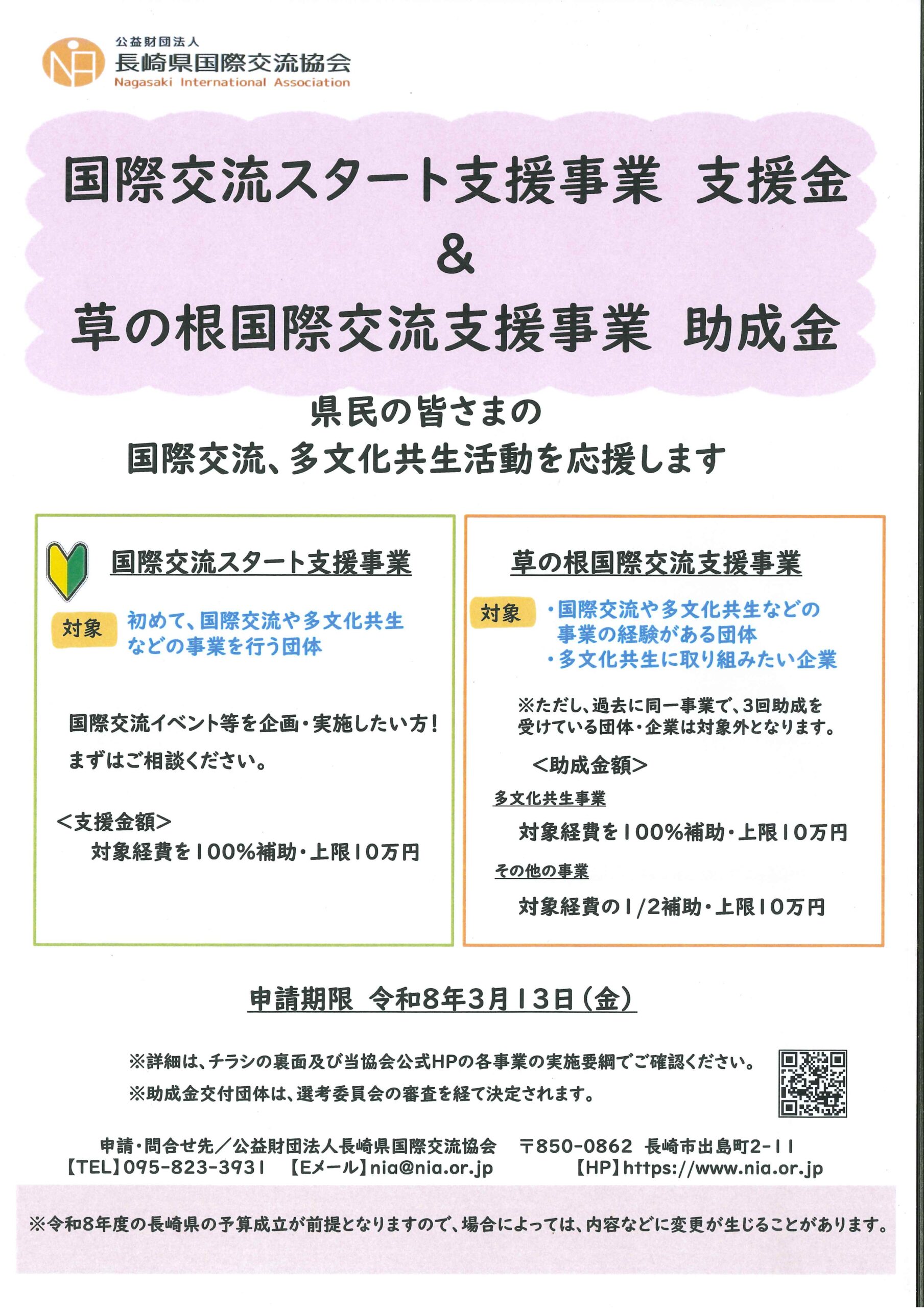 国際交流・多文化共生活動をご検討中の方へ 2026年2月24日 情報発信 国際交流・多文化共生活動をご検討の方へ ㅤㅤㅤㅤ 長崎県国際交流協会から、助成金事業の知らせです。 ㅤㅤㅤㅤ 詳細は、チラシやホームページの募集要項をご確認ください。 ㅤㅤㅤㅤ ※この度の募集は、令和8年度の長崎県の予算成立を前提に募集するもので、 場合によっては、内容などに変更が生じることがあります。 ホームページ: https://www.nia.or.jp/index.php/view/15