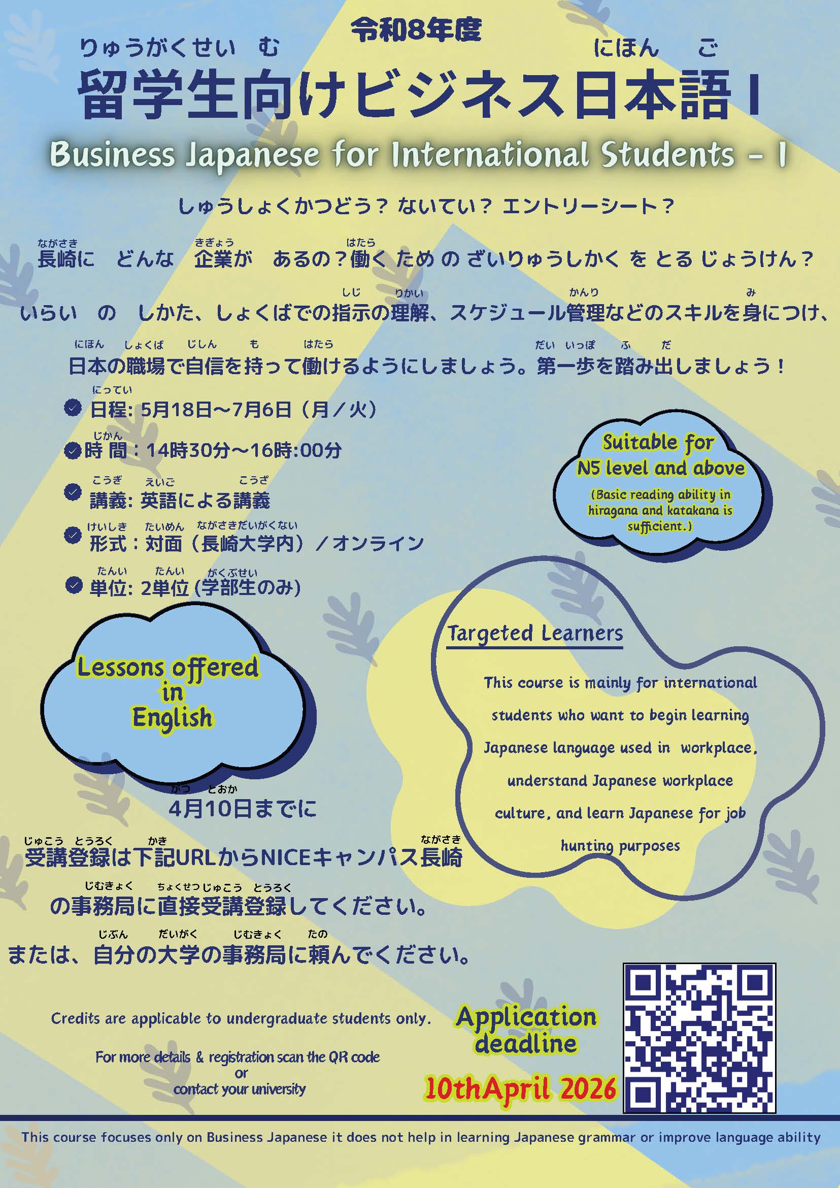 ◆留学生◆日本語(にほんご)講座(こうざ)のおしらせ 2026年3月31日 学生募集 長崎(ながさき)県内(けんない)の 留学生(りゅうがくせい)の皆(みな)さんへ講座(こうざ)のお知(し)らせです。 ㅤㅤㅤㅤ 「留学生(りゅうがくせい)向(む)けビジネス日本語(にほんご)Ⅰ」 ㅤㅤㅤㅤ 長崎(ながさき)県内(けんない)の留学生(りゅうがくせい)や 社会人(しゃかいじん)の方が学(まな)べる講座(こうざ)です。 ㅤㅤㅤㅤ 詳細(しょうさい)や申込(もうしこ)みは、チラシを見(み)てください。