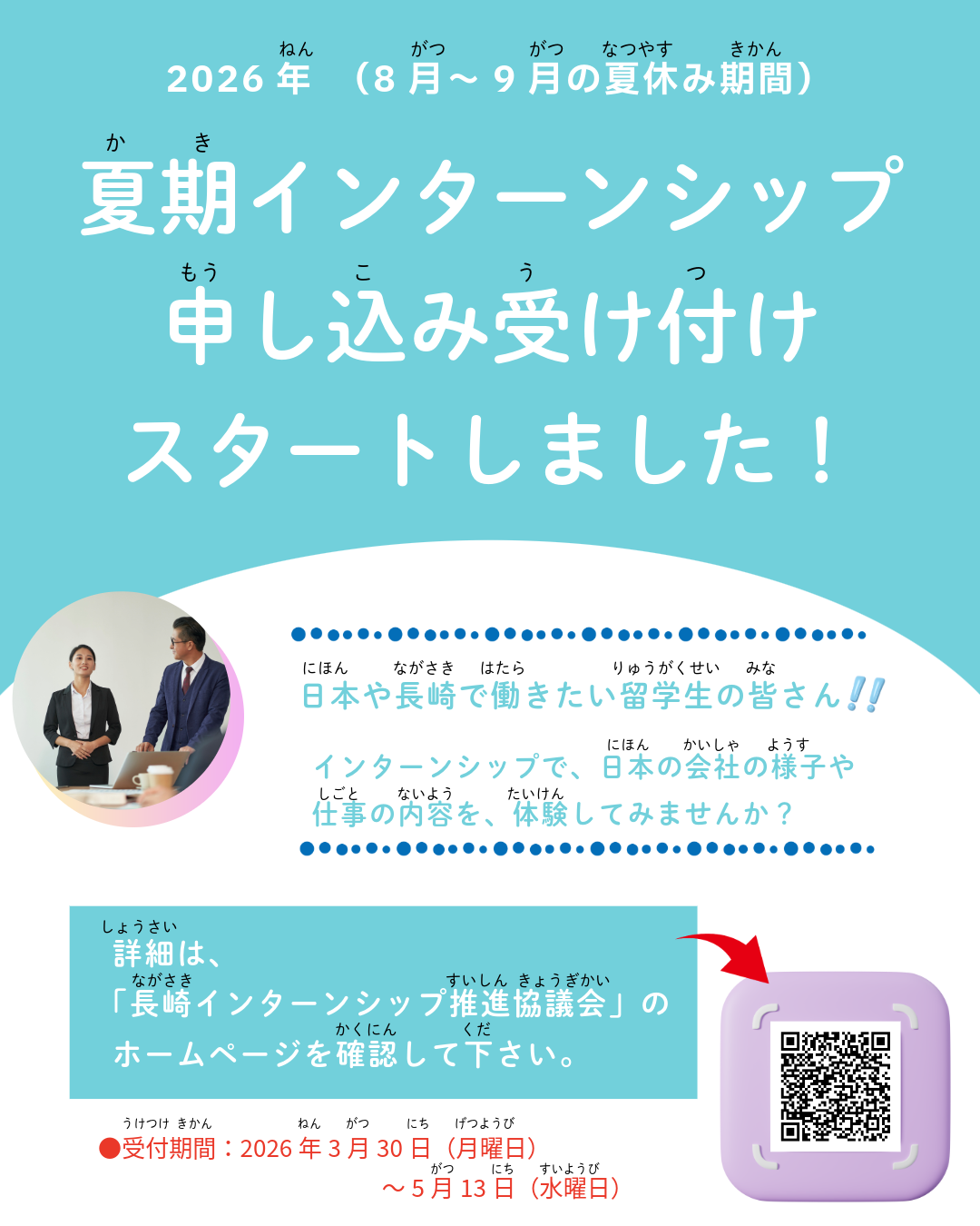 ◆留学生◆「夏期(かき)インターンシップ」についてのお知(し)らせ 2026年4月8日 就職支援 日本(にほん)や長崎(ながさき)で働(はたら)きたい、 または、働(はたら)くことに興味(きょうみ)がある留学生(りゅうがくせい)の皆(みな)さんへ ㅤㅤㅤㅤ 夏期(かき)インターンシップについてのお知(し)らせです。 ㅤㅤㅤㅤ インターンシップの申(もう)し込(こ)み受付(うけつけ)が始まっています。 ㅤㅤㅤㅤ 詳細(しょうさい)や申込(もうしこ)みについては、チラシのQRコードから、 「長崎(ながさき)インターンシップ推進(すいしん)協議(きょうぎ)会(かい)」 のホームページを確認(かくにん)してください。